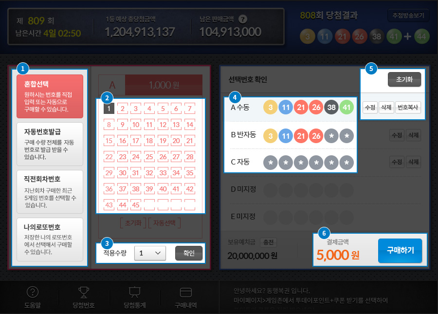 - 반자동 : 번호를 부분적으로 선택한 방식으로, 자동으로 선택한 부분은 구매 후 번호 확인이 가능합니다.