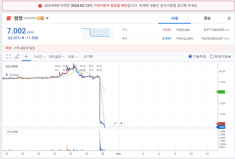 업비트, 빗썸, 코인원은 3월 12일 오후 3시 썸씽에 대한 거래를 종료한다고 했습니다.