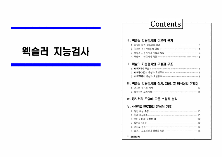 웩슬러지능검사는 세계 최초로 개발된 표준화된 지능검사로서 현재까지도 널리 사용되고 있으며, 한국판 웩슬러지능검사는 미국판과 동일한 내용으로 제작되어 국내 임상현장에서 활용되고 있다. 웩슬러지능검사는 개인의 지적능력을 평가하기 위한 목적으로 고안되었으며, 언어성 소검사와 동작성 소검사로 구성되어있다. 또한 각 소검사는 여러 개의 하위척도로 이루어져있어 보다 구체적인 정보를 제공한다.